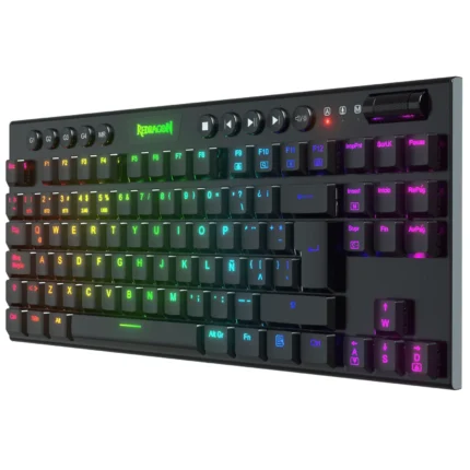 La conexión Bluetooth permite una conexión sencilla y eficiente con múltiples dispositivos; y el modo alámbrico asegura un uso ininterrumpido mientras se carga. Equipado con interruptores mecánicos Redragon Low-Profile Red, este teclado proporciona una respuesta lineal suave y silenciosa, con un recorrido de tecla más corto que facilita activaciones rápidas, ideal para largas sesiones de juego y una escritura cómoda. Su diseño TKL (Tenkeyless) elimina el teclado numérico, liberando valioso espacio para movimientos amplios del mouse.
